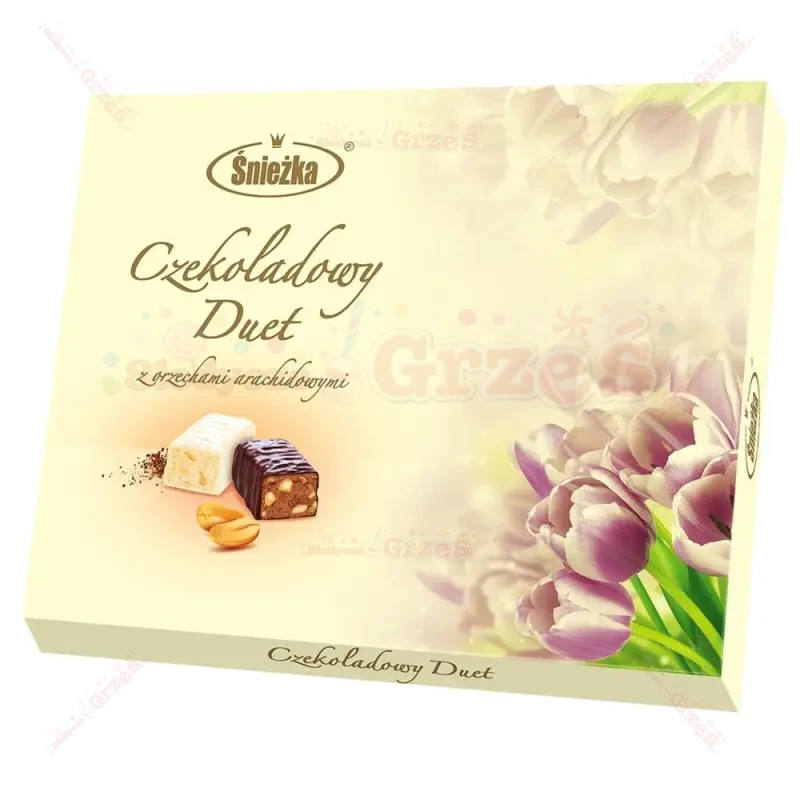 Bombonierka Czekoladowy Duet - mix cukierków Michałki z Hanki i Michałki z Hanki Milk. Pierwsza Komunia Święta to wyjątkowy momentem, a Czekoladowy Duet to doskonały wybór na słodkie urozmaicenie tego ważnego dnia. Klasyczna kombinacja smaków, połączenie kultowch Michałków z Hanki ® - cukierków czekoladowych z orzeszkami arachidowymi, oraz Michałków z Hanki ® Milk - cukierków z orzeszkami arachidowymi w bialej polewie. Takie połączenie czyni go idealnym pomysłem na komunijny upominek. Elegancka bombonierka komunijna to wyjątkowy upominek, który doskonale podkreśla uroczysty charakter Pierwszej Komunii Świętej. Starannie dobrane słodkości zachwycają nie tylko smakiem, ale także estetycznym wyglądem, tworząc spójną i gustowną całość. To idealny prezent lub dodatek do życzeń – subtelny, stylowy i zawsze mile widziany.