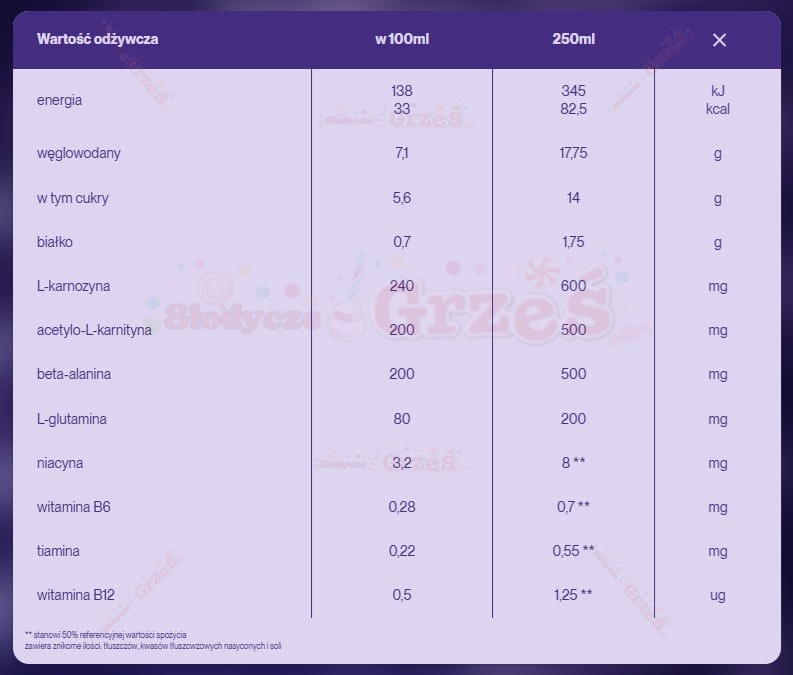 Skład: Soki owocowe odtworzone z zagęszczonych soków owocowych (jabłko, czarna jagoda), woda, dwutlenek węgla, L-karnozyna, acetyl-L-karnityna, beta-alanina, L-glutamina, naturalne aromaty, witaminy z grupy B (niacyna, witamina B6, tiamina, witamina B12).